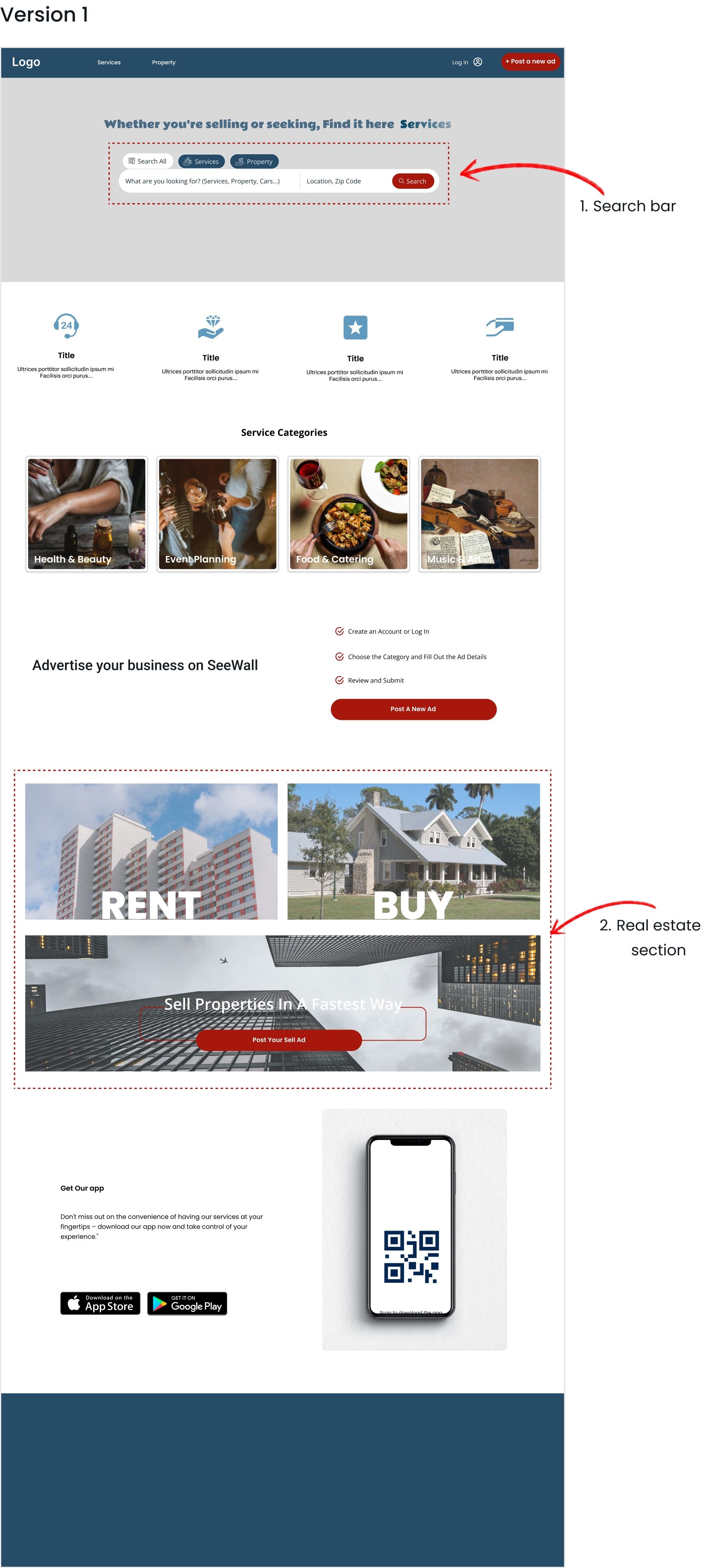 In the final version, our focus shifted towards refining the interface design to ensure a minimalistic and user-friendly experience. To highlight the importance of the search bar, we replaced the hero image with a prominent search bar against a white background. Additionally, we revamped the real estate section to enhance user understanding and guide them to the most frequently accessed pages.