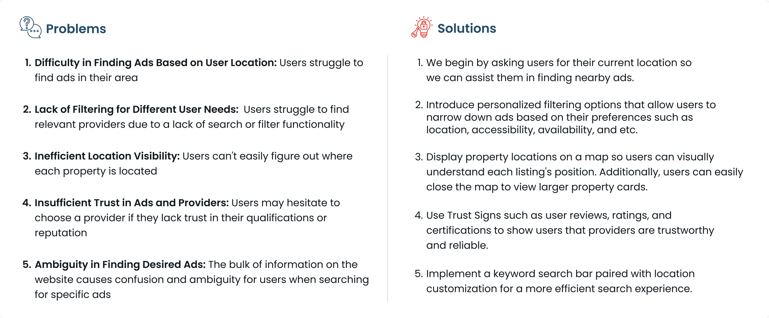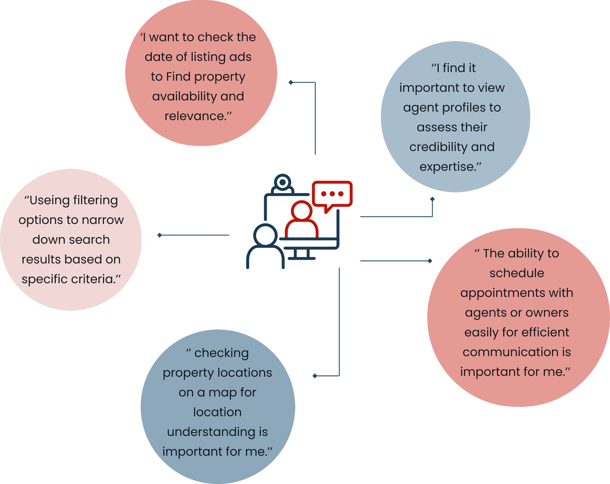 In the second step, we interviewed several users to understand their needs and pain points in finding properties. We also conducted usability testing on similar websites.